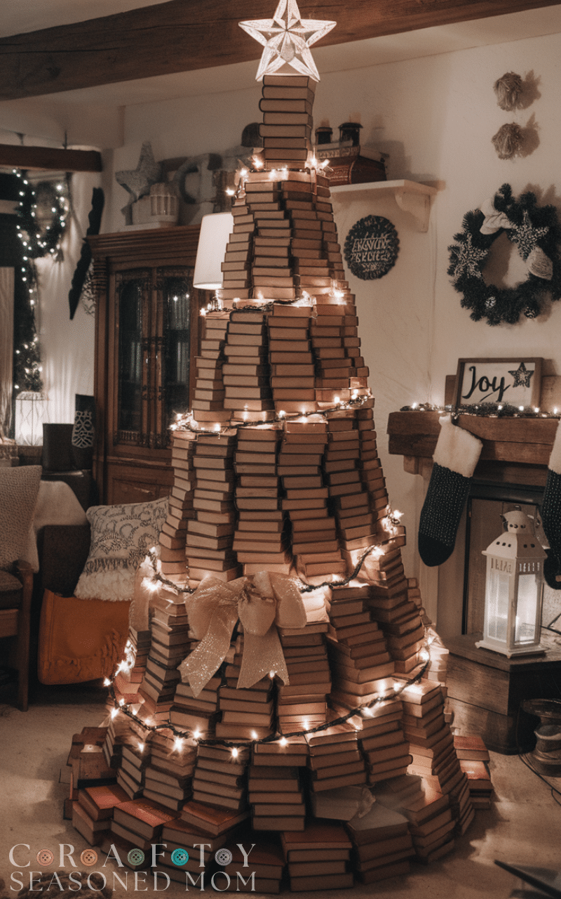If you love reading then this creative Christmas tree is perfect for you because it lets you build a cozy and personal decoration out of your favorite books. You can stack the books in a circular pattern until they form a tree shape and then wrap them with fairy lights so they shine beautifully in the evening. You can also add a star or a bow on top for a festive finish. This creative Christmas tree is a clever way to show your personality and it adds warmth and charm to any room while filling your space with stories and imagination.