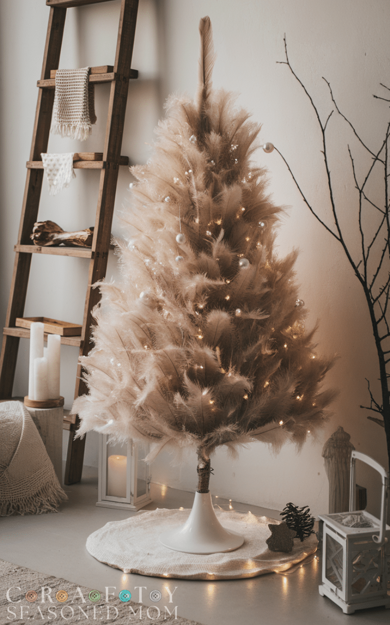 A feather tree feels soft elegant and timeless and it’s among the most creative Christmas trees for modern decor. You can create one using white or colored feathers attached to a cone or small branch structure. Add gentle lights or pearl ornaments for extra charm. This creative Christmas tree feels light airy and luxurious and it transforms your living space into a dreamy winter haven.