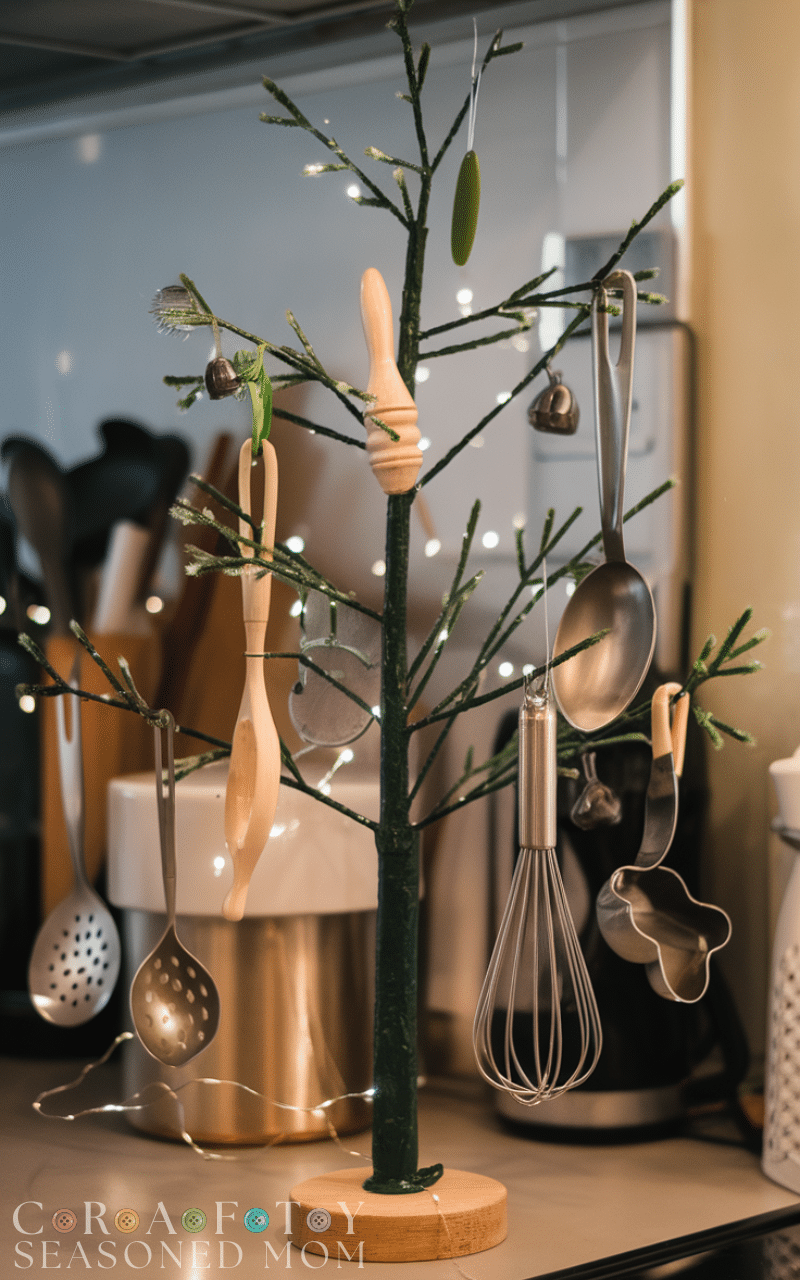 For cooking lovers the kitchen utensil tree is one of the most creative Christmas trees that turn your everyday tools into art. You can hang spoons whisks and cookie cutters on a small kitchen tree or shape them into a tree display on the wall. Add small fairy lights for sparkle. This creative Christmas tree is playful and practical and it brings festive charm right into the heart of your home.