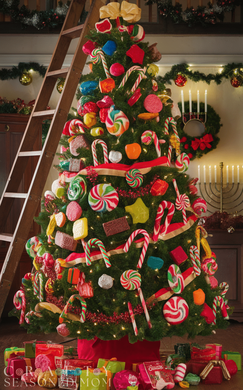 Sweeten your home with a candy tree which is absolutely one of the most creative Christmas trees you can make. You can use real or fake candies like lollipops candy canes and chocolates to decorate your tree. Add ribbons in bright colors for an extra festive touch. This creative Christmas tree fills the room with fun and excitement especially for kids and it turns your holiday into a colorful candy wonderland.