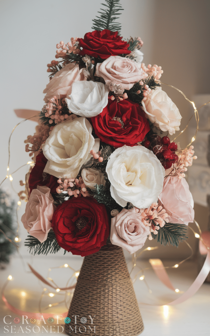 A floral tree combines elegance and beauty making it one of the most creative Christmas trees for those who adore blooms. You can use faux flowers in red white or blush tones and attach them to a small artificial tree or a cone base. Add some lights and ribbons for sparkle. This creative Christmas tree adds a romantic and refreshing touch to your holiday decor and it feels both sophisticated and joyful.