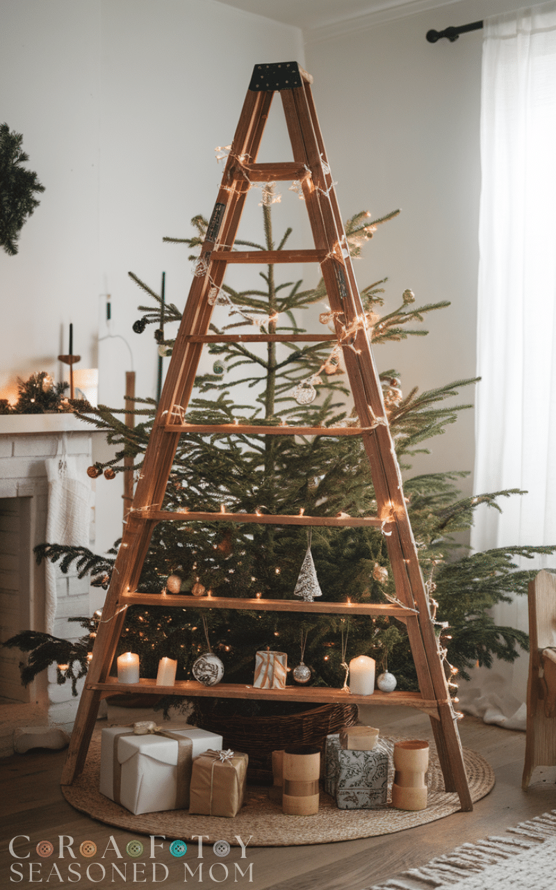 A ladder tree is both rustic and stylish and it’s one of the most creative Christmas trees for those who love simple and clever decor. You can open a wooden ladder and wrap it with lights garlands and ornaments and even place gifts or candles on its steps. This creative Christmas tree gives a warm handmade vibe and it’s ideal for cozy homes or anyone who loves upcycling.