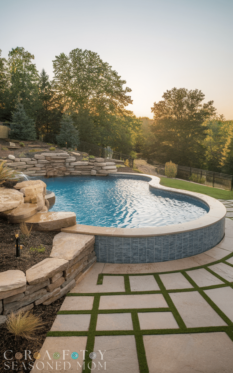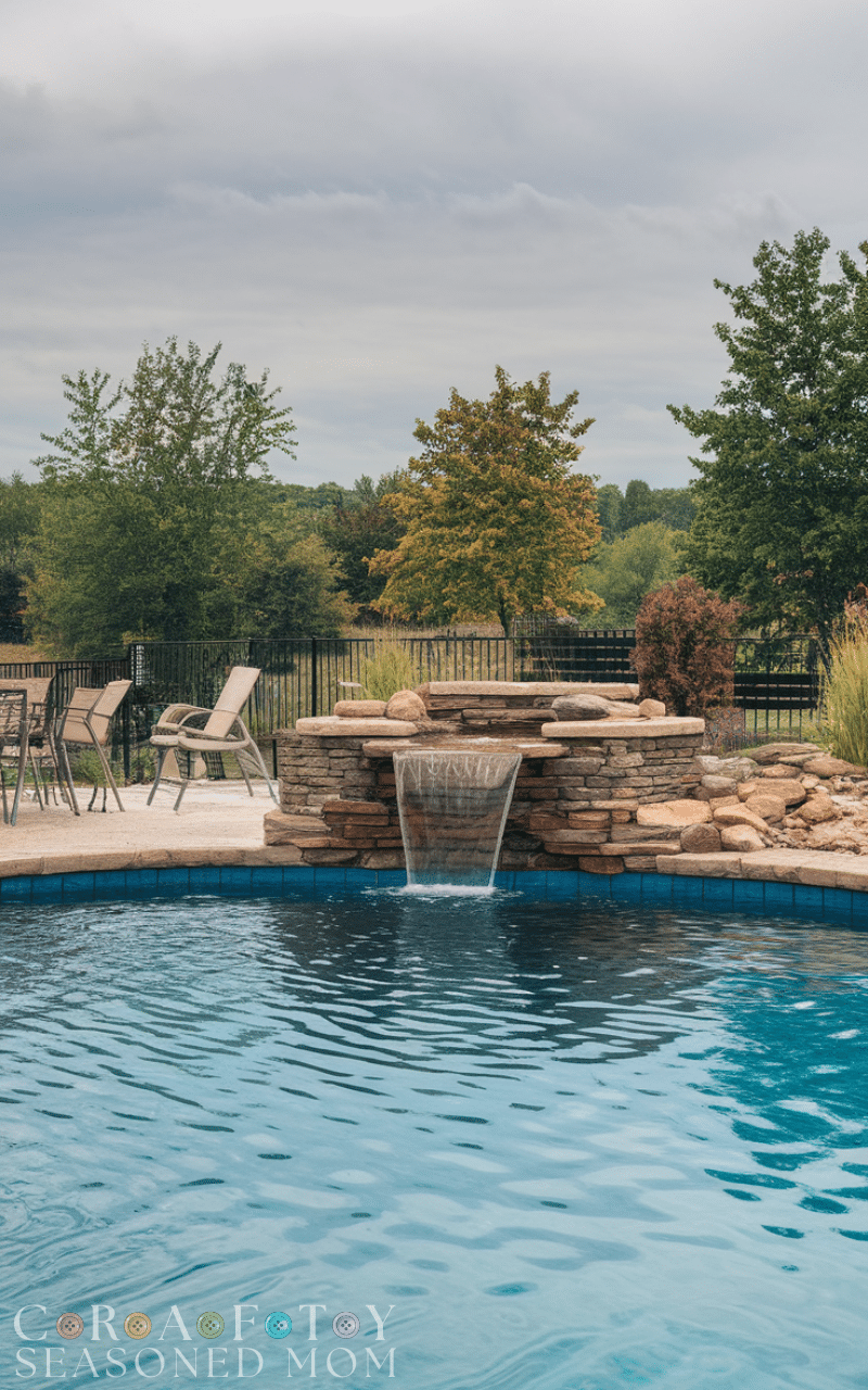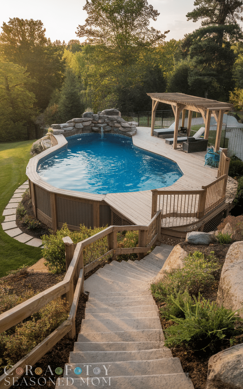 Incorporating a small waterfall is one of the most eye-catching above ground pool ideas. A cascading water feature adds soothing sounds and a touch of luxury. You can use stacked stone or modern metal designs for the waterfall. This addition enhances relaxation and gives your backyard a spa-like feel. These above ground pool ideas elevate the overall atmosphere and create a peaceful retreat right outside your door.