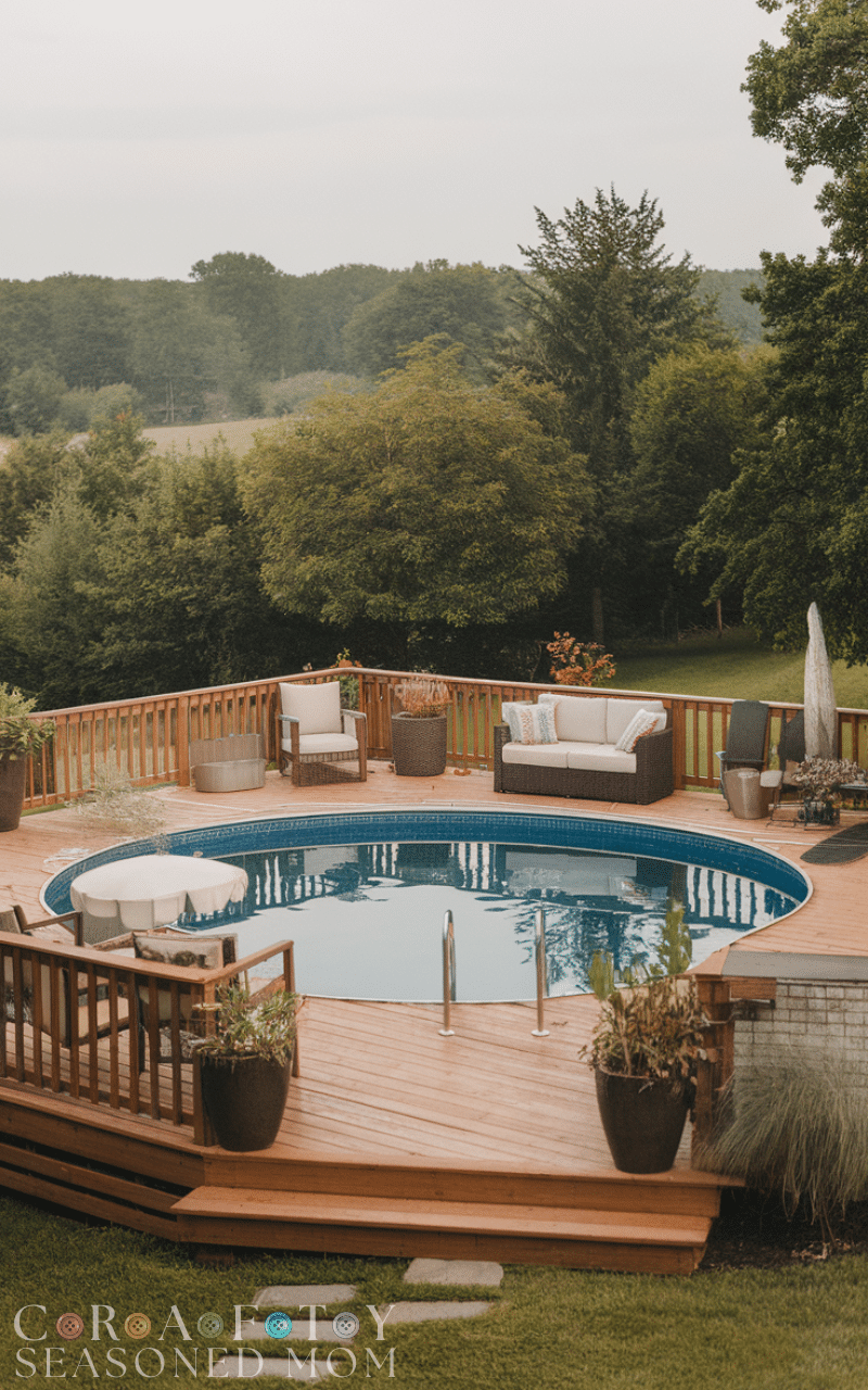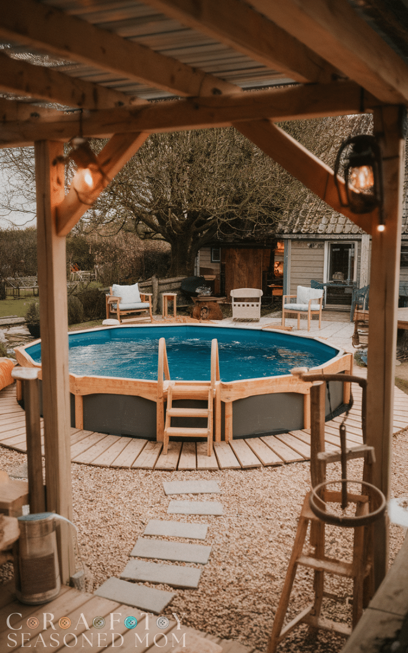 Rustic above ground pool ideas focus on natural wood, gravel paths, and simple outdoor furniture. Adding a wooden ladder, lantern-style lights, and reclaimed wood decking enhances the farmhouse look. Neutral colors and soft textiles create a warm, welcoming space. This style blends beautifully with countryside homes and gardens. These above ground pool ideas are perfect if you love a cozy, relaxed aesthetic that feels timeless and inviting for both family and guests.