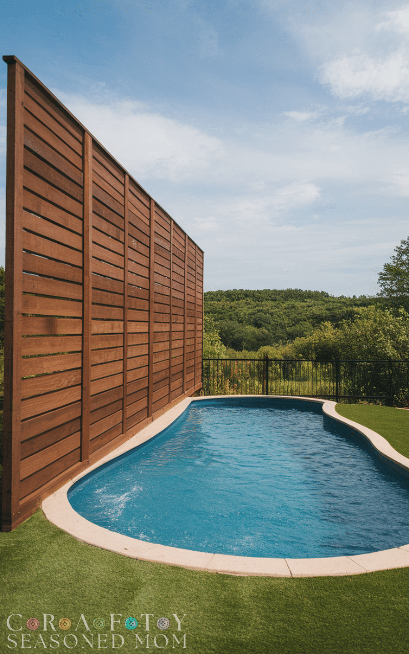 If you want more seclusion, adding privacy screens is one of the smartest above ground pool ideas. Wooden slats, bamboo panels, or tall hedges can block neighbors’ views and reduce wind. Privacy elements make the pool area feel intimate and peaceful. You can also hang outdoor curtains for a soft, elegant touch. Combining greenery with fencing enhances the natural vibe and blends beautifully with the backyard. These above ground pool ideas are ideal for homeowners who value comfort, relaxation, and a calm environment.