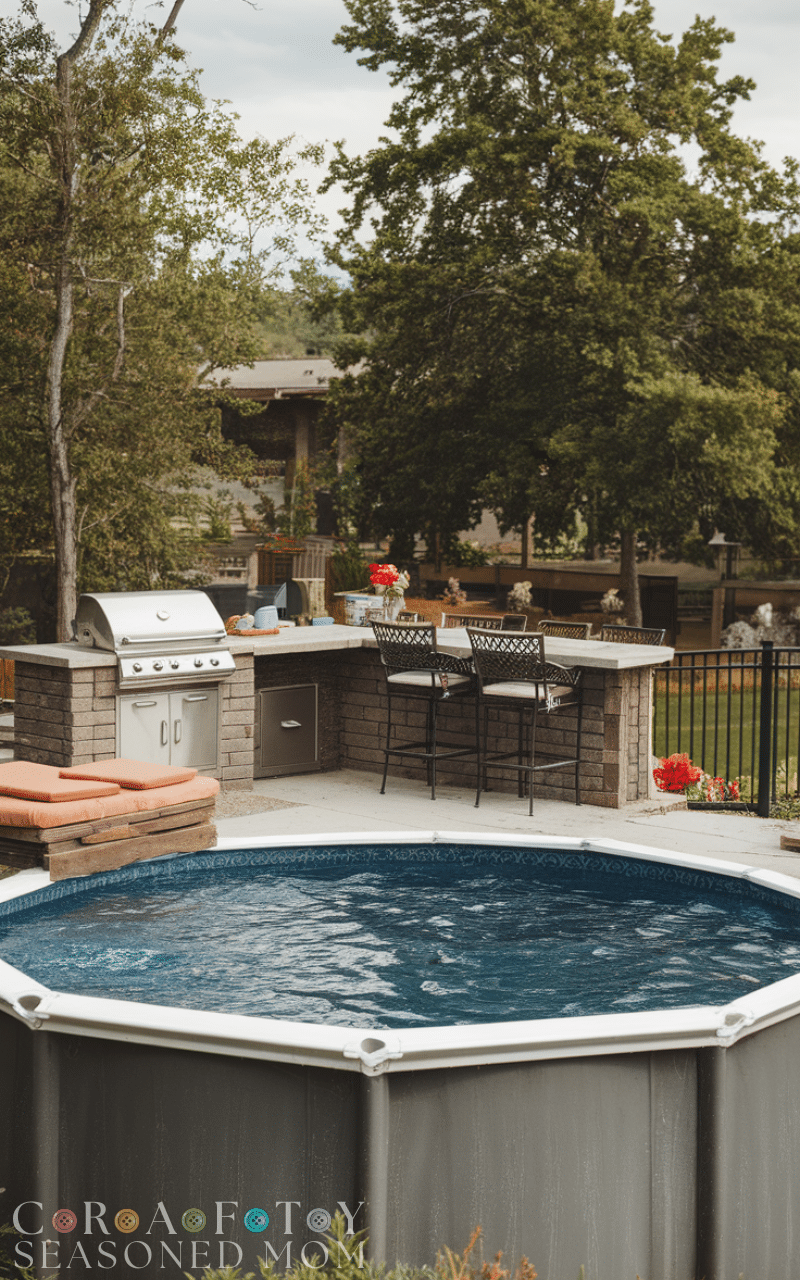 Combining cooking and swimming is one of the most exciting above ground pool ideas. An outdoor kitchen with a grill, counter space, and bar seating creates the perfect entertainment zone. Guests can enjoy meals without leaving the pool area. Adding shade and durable materials ensures long-term usability. These above ground pool ideas are ideal for hosting summer parties and family gatherings with comfort and convenience.