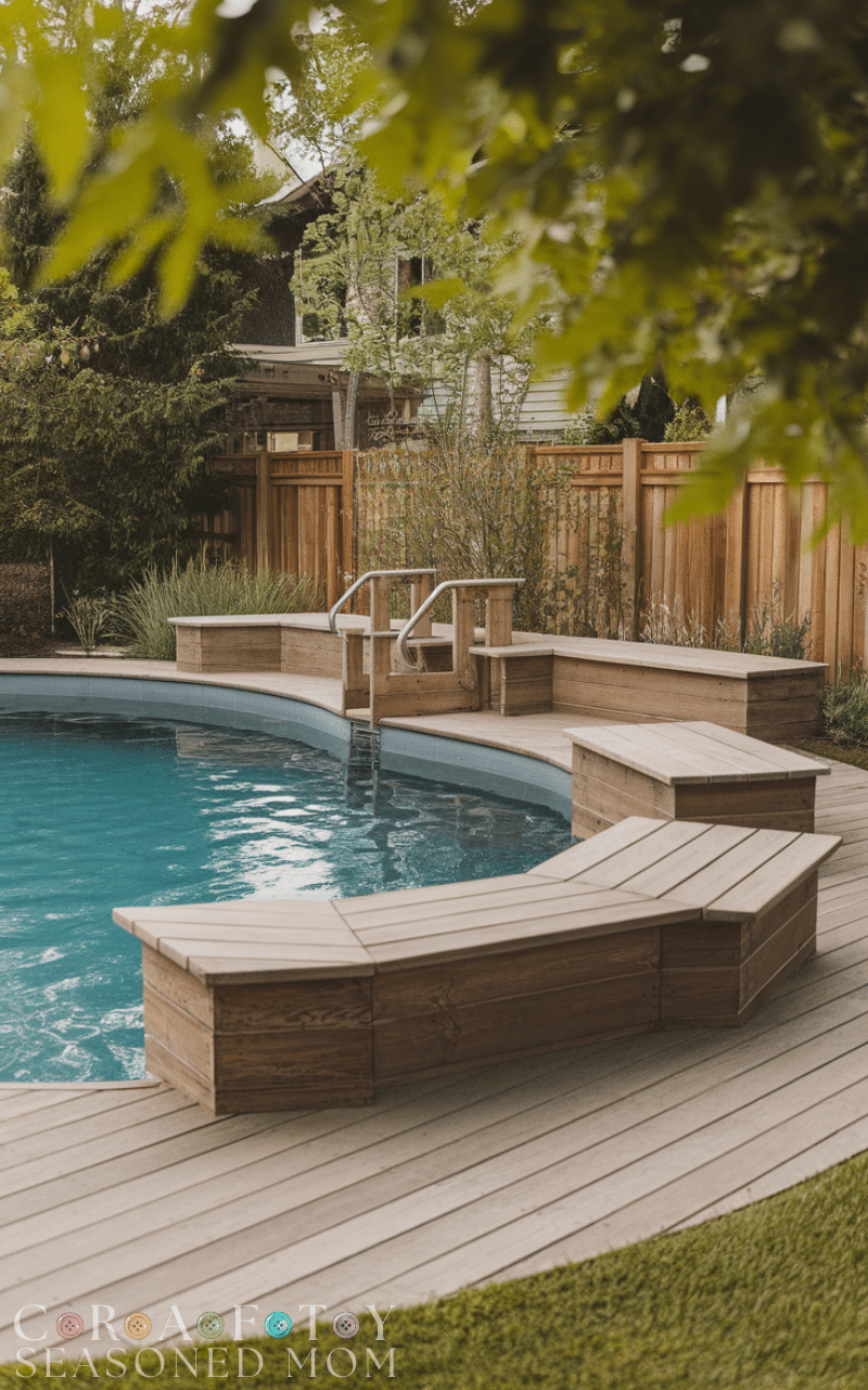 Functional above ground pool ideas often include built-in bench seating around the deck. Benches provide extra seating without taking up too much space. You can add waterproof cushions for comfort and storage compartments underneath. This design makes hosting easier and keeps the area organized. It also creates a social atmosphere where guests can relax near the water. Including seating in your above ground pool ideas ensures practicality while maintaining a stylish outdoor setting.
