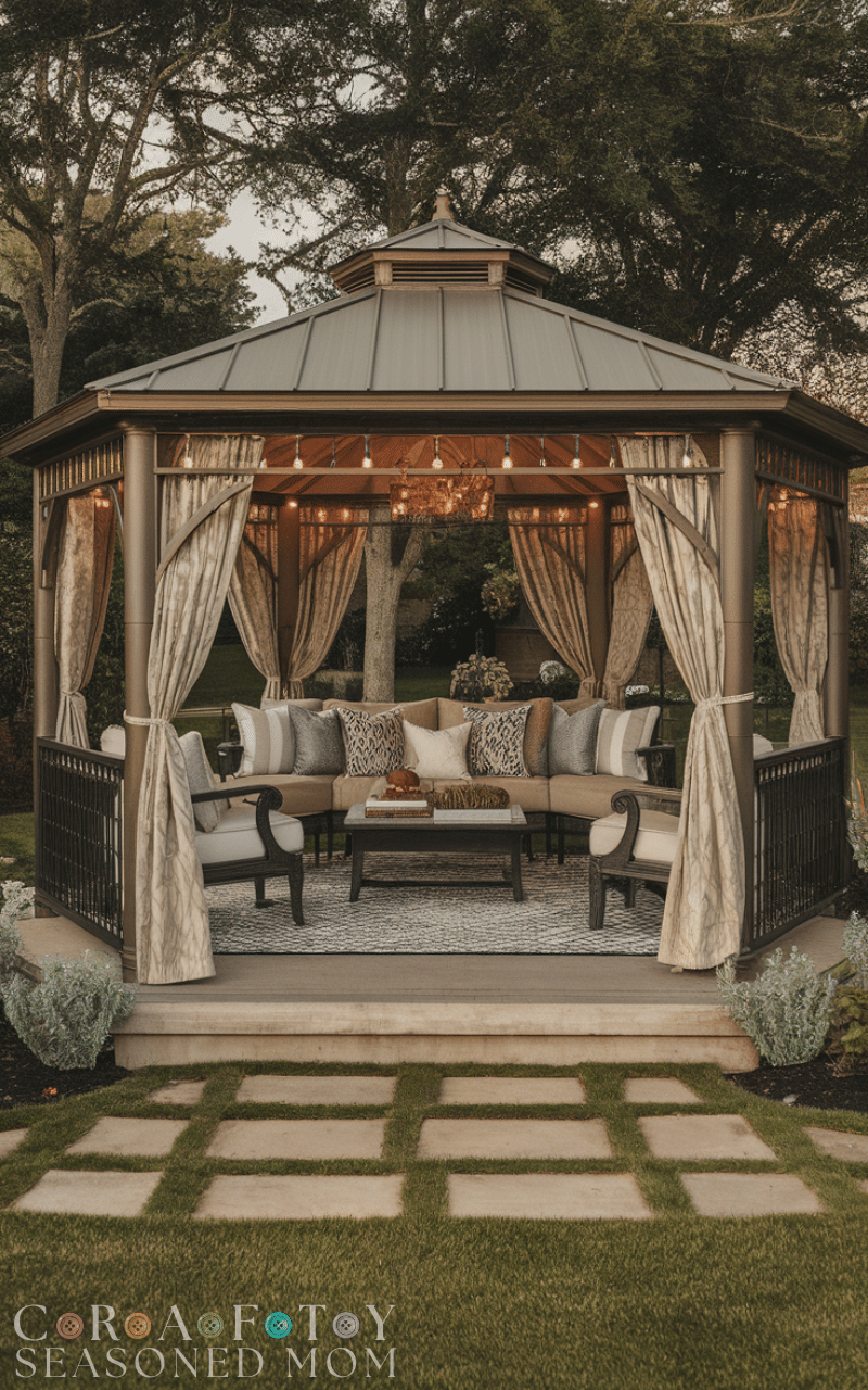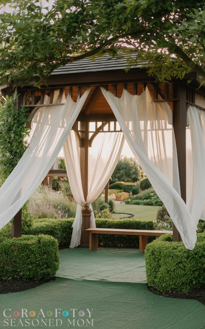 Backyard gazebo ideas become more private and luxurious when you add flowing outdoor curtains. Curtains provide shade, block wind, and create an intimate feeling inside the gazebo. These backyard gazebo ideas are ideal for relaxing afternoons or romantic evenings outdoors. Light fabrics in white or beige keep the space airy, while darker colors add drama. Curtains also help protect furniture from sun and dust while enhancing the overall look.