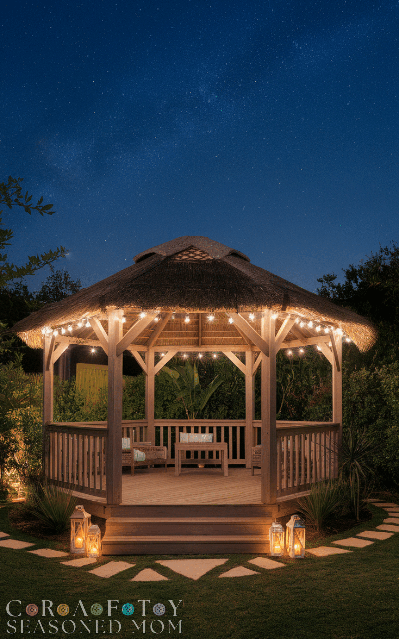 Backyard gazebo ideas truly shine at night when string lights are added for a magical atmosphere. Soft lighting creates warmth and makes the gazebo usable even after sunset. These backyard gazebo ideas are great for dinners, gatherings, or quiet evenings outside. Solar or LED string lights are energy-efficient and easy to install. Combined with candles or lanterns, your gazebo becomes a dreamy outdoor retreat.
