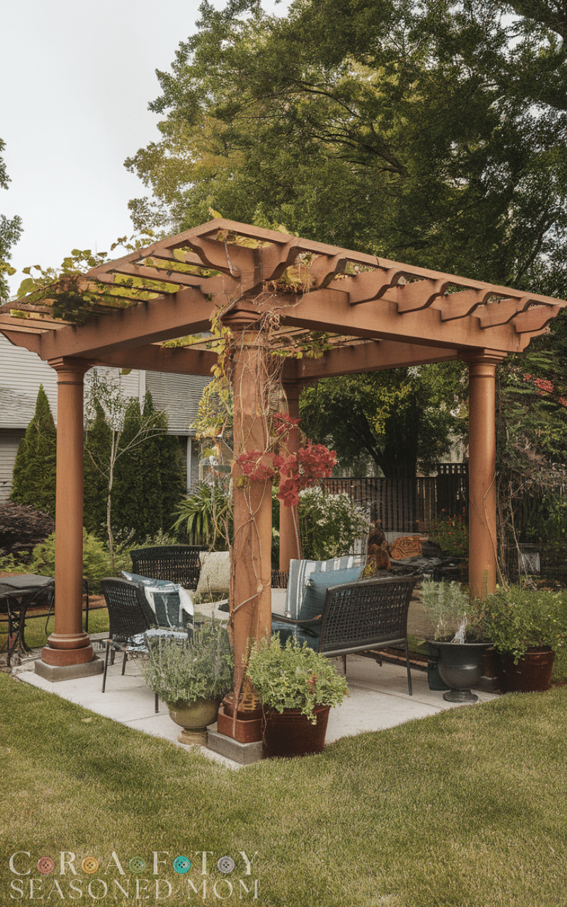 Backyard gazebo ideas don’t always need solid roofs, pergola-style gazebos offer partial shade while keeping an open, airy feel. This design allows sunlight to filter through while still defining a cozy outdoor zone. Backyard gazebo ideas like this work beautifully with climbing plants such as vines or bougainvillea. Over time, greenery creates natural shade and a stunning visual effect. It’s a perfect blend of structure and nature.