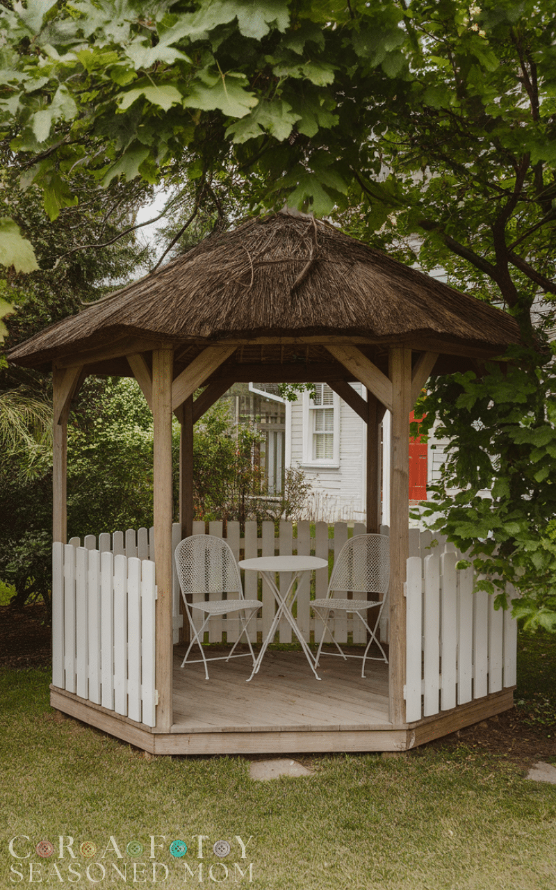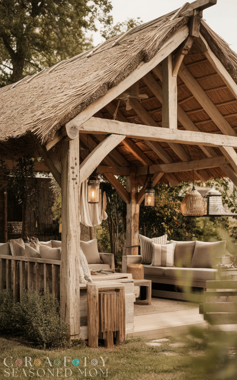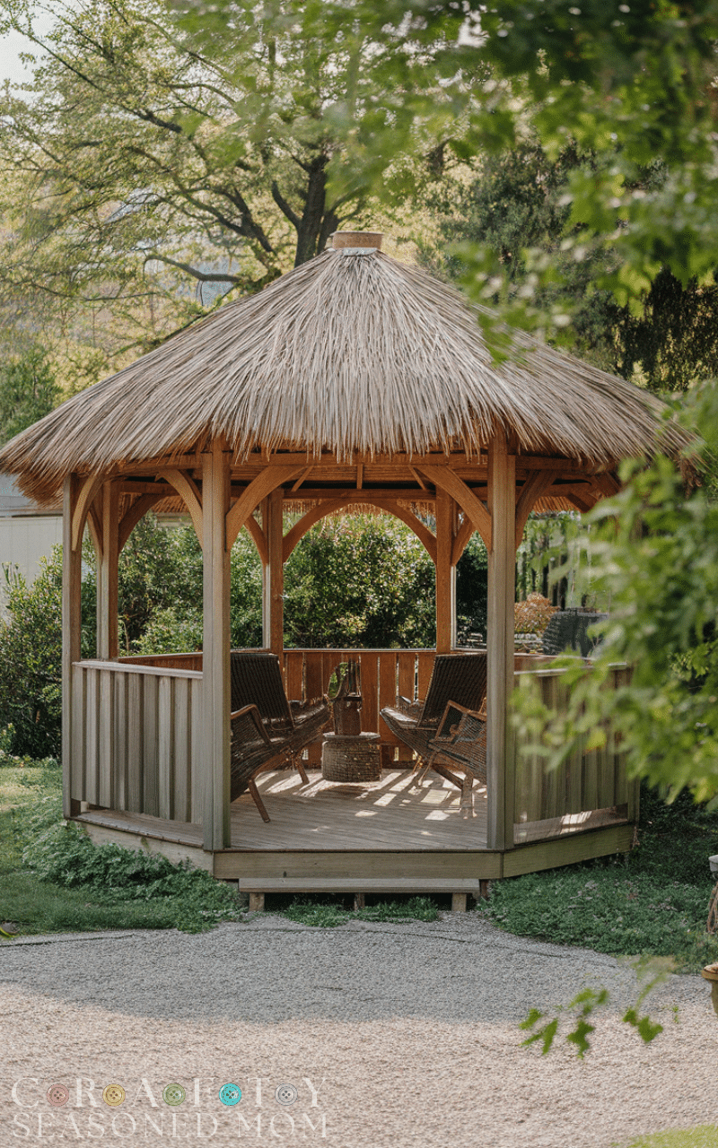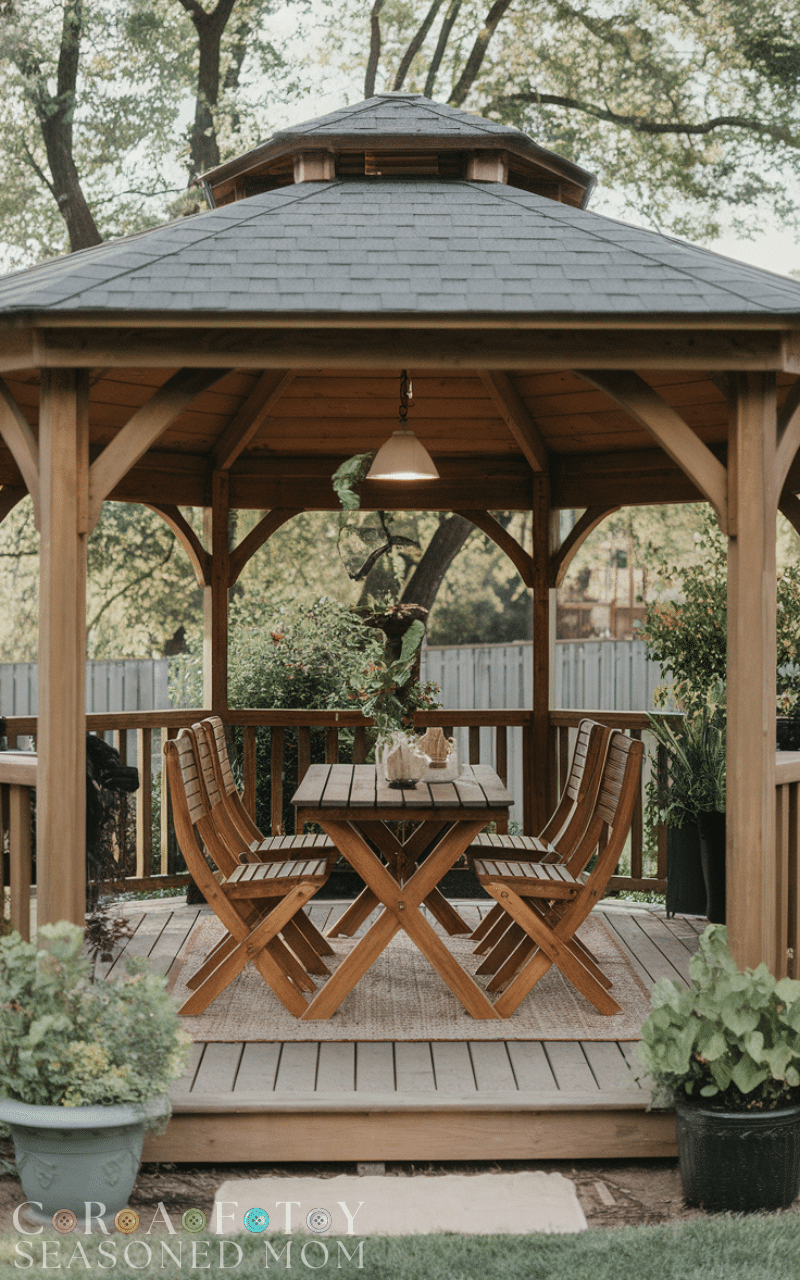 Backyard gazebo ideas with a rustic farmhouse style bring warmth and character to your yard. Weathered wood, exposed beams, and simple finishes create a cozy countryside feel. These backyard gazebo ideas pair beautifully with wooden furniture and neutral textiles. Add lanterns or vintage décor for extra charm. This style feels welcoming, relaxed, and perfect for casual outdoor living.