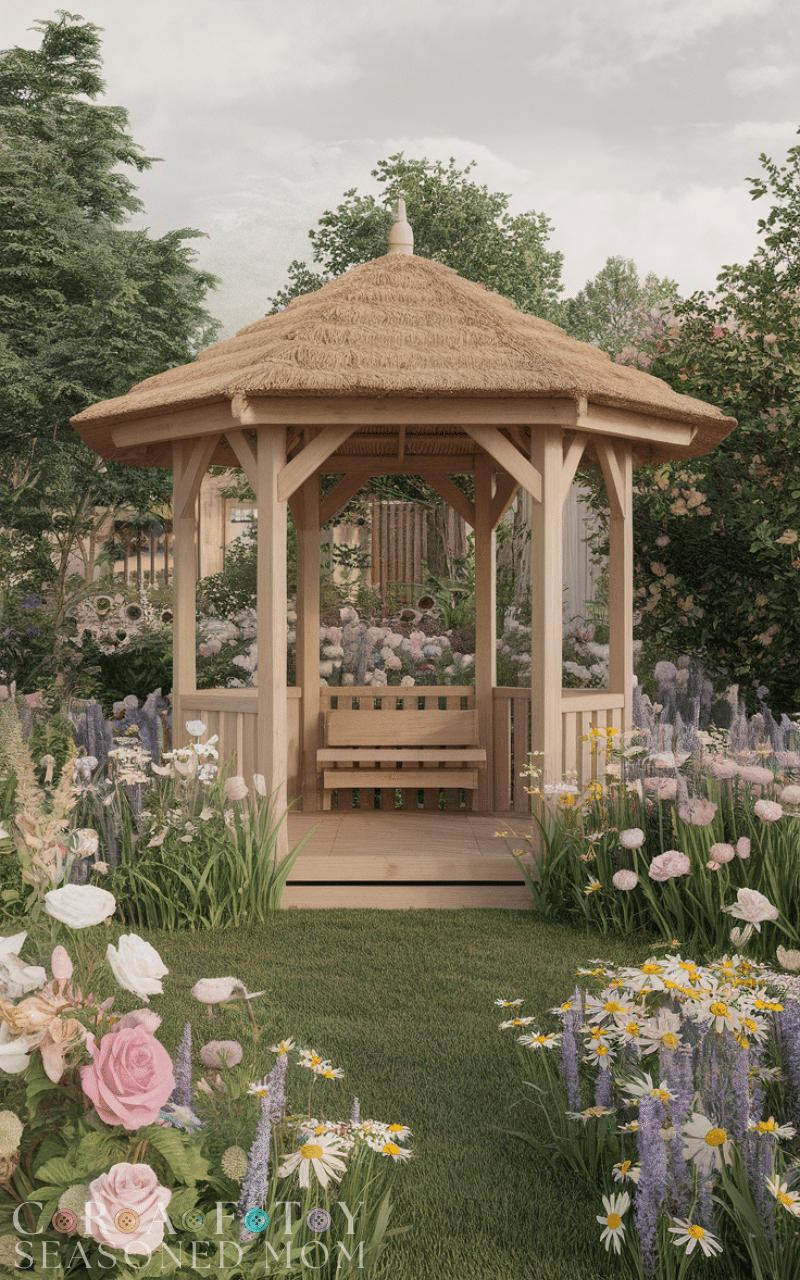 Backyard gazebo ideas feel romantic when the structure is placed in the middle of a flower-filled garden. Surrounded by blooms, the gazebo becomes a peaceful escape and a visual focal point. These backyard gazebo ideas are perfect for morning coffee, meditation, or reading. Choose soft colors and natural materials to complement the garden setting. The result is a serene and picturesque outdoor space.