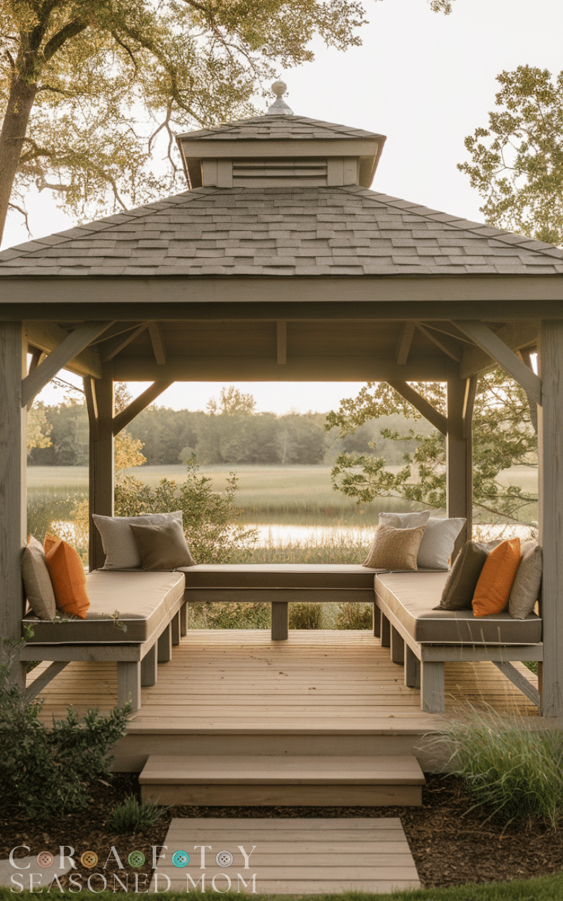 Backyard gazebo ideas become more functional with built-in benches or seating along the sides. This saves space and creates a clean, organized look. These backyard gazebo ideas are ideal for entertaining guests or enjoying family meals outdoors. Add cushions and throw pillows to increase comfort and style. Built-in seating also reduces the need for extra furniture, keeping the space uncluttered.
