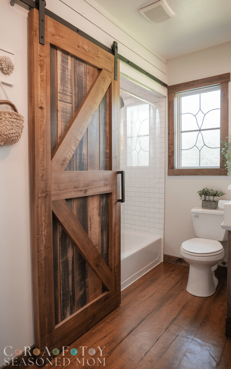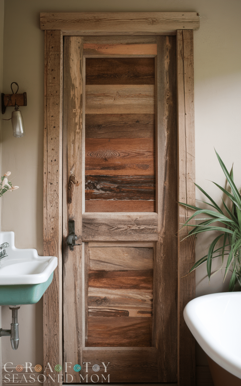 Rustic bathroom door ideas using reclaimed wood add personality and warmth. Each door has unique textures and natural imperfections that make it special. This style pairs beautifully with farmhouse or vintage bathrooms. Proper sealing ensures moisture protection. These bathroom door ideas create a cozy and inviting atmosphere while being environmentally friendly.