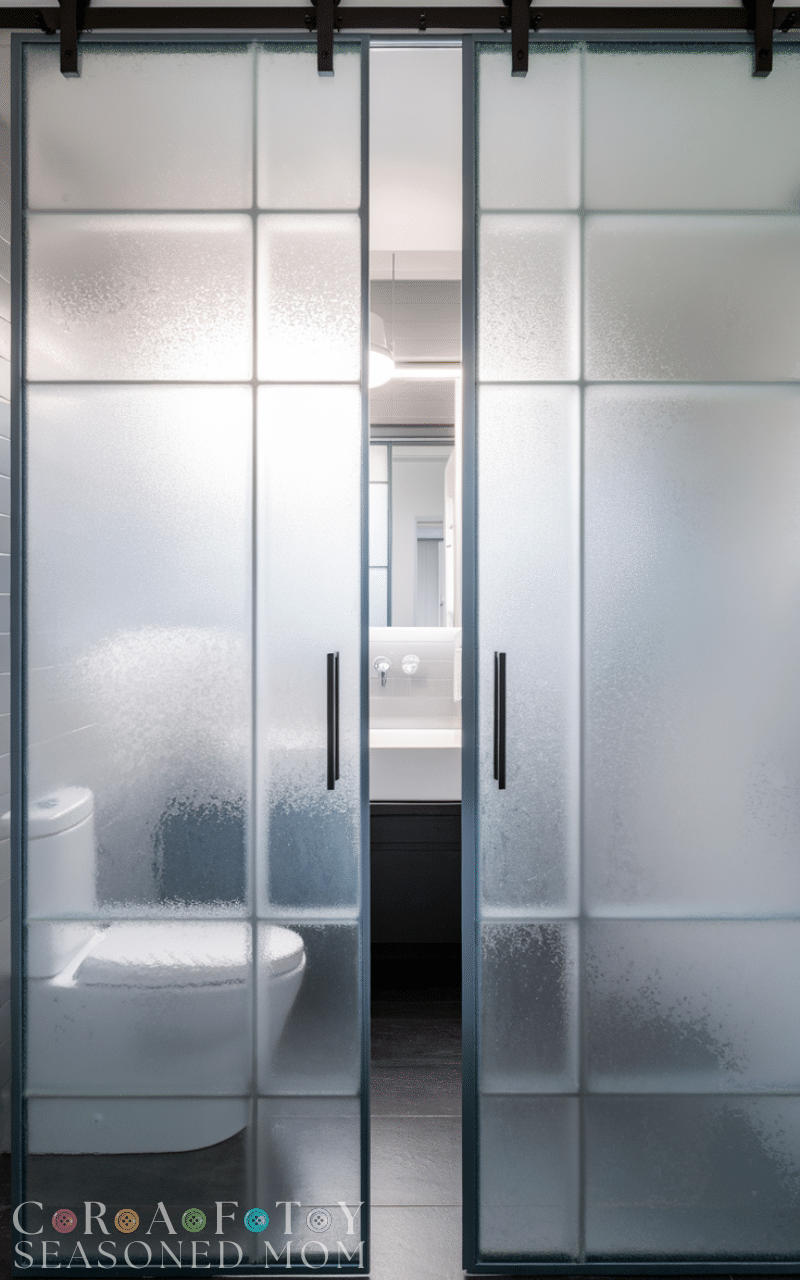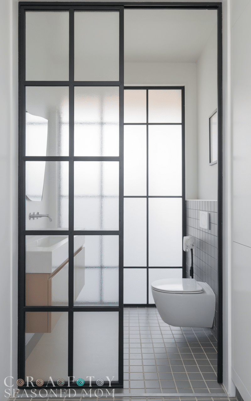 Frosted glass bathroom door ideas are perfect for those who want light without losing privacy. The blurred effect allows brightness to pass through while keeping the interior hidden. This is ideal for bathrooms located in darker hallways. Frosted glass designs can look sleek and modern, especially with black or silver frames. These bathroom door ideas create an airy atmosphere and make small bathrooms feel more open. They are easy to clean and resistant to humidity, making them both practical and beautiful.