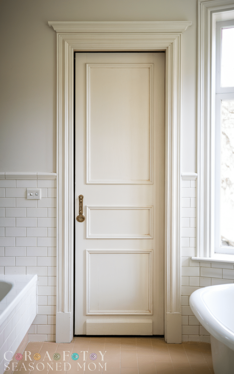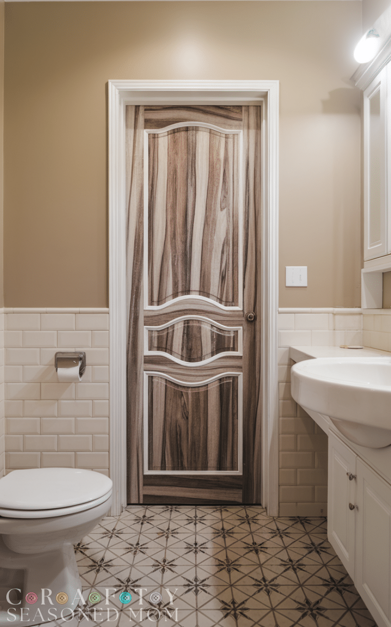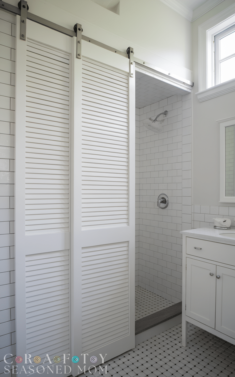 Louvered bathroom door ideas are great for ventilation. The horizontal slats allow air circulation, helping reduce humidity and prevent mold buildup. This is especially helpful in bathrooms without windows. Painted white, these doors give a coastal or cottage vibe. These bathroom door ideas balance airflow and privacy effectively. They are lightweight, stylish, and practical for maintaining a fresh bathroom environment.
