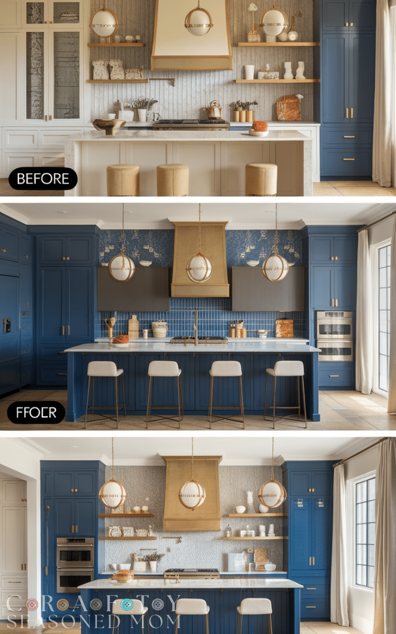 A full makeover represents the most complete form of blue and gold kitchen ideas and this transformation includes blue cabinetry gold hardware gold lighting blue backsplashes and even gold accents through decor items and this layered approach creates a luxurious cohesive look that feels refined and expressive and when you combine different shades of blue with warm gold tones the space becomes vibrant yet balanced and you can mix textures such as matte cabinets glossy tiles natural stone or brushed metal to create depth and interest and this makeover works well for homeowners who want a high impact design that feels both modern and timeless and this is why it stands as the strongest and most impressive of all blue and gold kitchen ideas.