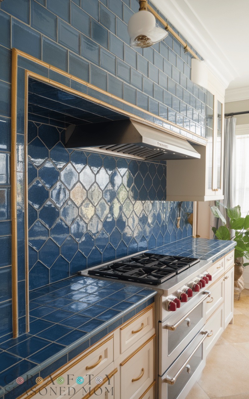 A blue tile backsplash is one of the most creative blue and gold kitchen ideas because it gives your space texture energy and personality and when you choose glossy blue tiles their reflective surface adds movement and shine and the addition of gold trim or gold edges elevates the entire look by adding a touch of luxury and sophistication and this combination works with modern kitchens classic kitchens or even eclectic homes because the tiles act as artwork that transforms the wall and you can choose mosaic tiles subway tiles or geometric patterns depending on your taste and the gold trim acts like a frame that ties everything together and this mix helps your cooking space feel unique stylish and well designed which makes it one of the standout blue and gold kitchen ideas.