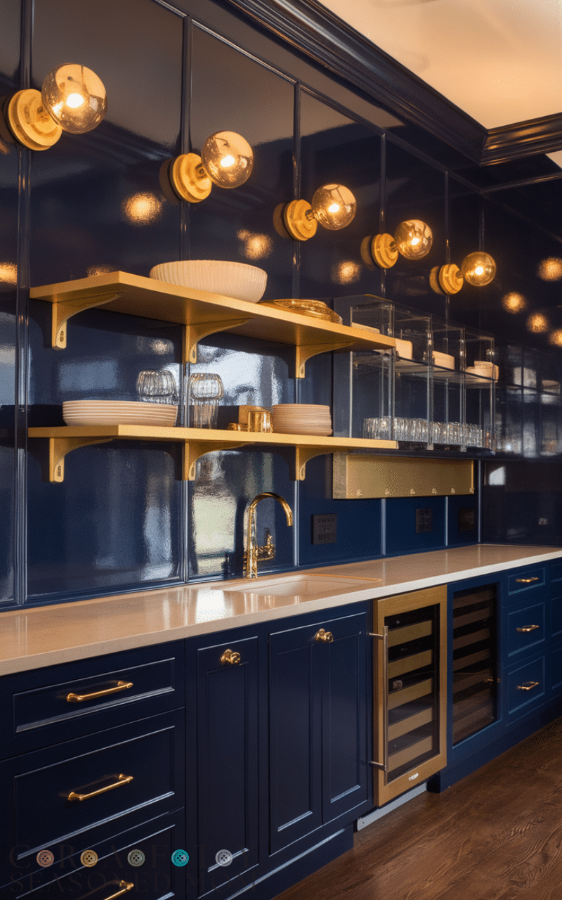 Midnight blue walls create a bold high impact backdrop which makes this one of the most artistic blue and gold kitchen ideas and this dramatic color instantly adds depth and personality and when you combine it with gold lighting the warm glow bounces off the darker walls which creates a beautiful contrast that feels modern and luxurious and this approach is perfect for people who want a kitchen that looks like a high end design magazine and you can balance the darkness with light countertops open shelves or glass cabinetry to keep everything bright and functional and the gold fixtures become the highlight of the room because the deep blue helps them stand out naturally and this pairing brings character richness and a unique sense of style which makes it a top choice within blue and gold kitchen ideas.