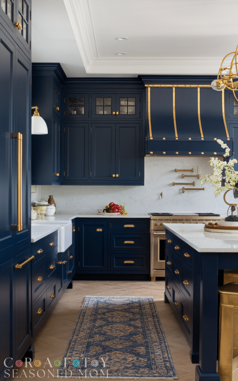 When you explore blue and gold kitchen ideas you will notice how deep navy cabinets instantly bring a rich and elegant mood to your cooking space and this idea works beautifully because the dark tone creates a grounded foundation while the gold hardware adds a warm glow that feels both classic and modern and when you apply this combination your kitchen gains a dramatic look without feeling heavy and the contrast keeps the design lively and welcoming and this style is perfect for people who enjoy a bold visual effect yet still want something easy to live with and you can pair these cabinets with marble backsplashes light wooden floors or soft white counters to balance everything and this blend makes your kitchen feel expensive and stylish while staying practical for daily use and this is why this choice remains one of the strongest blue and gold kitchen ideas in interior design.