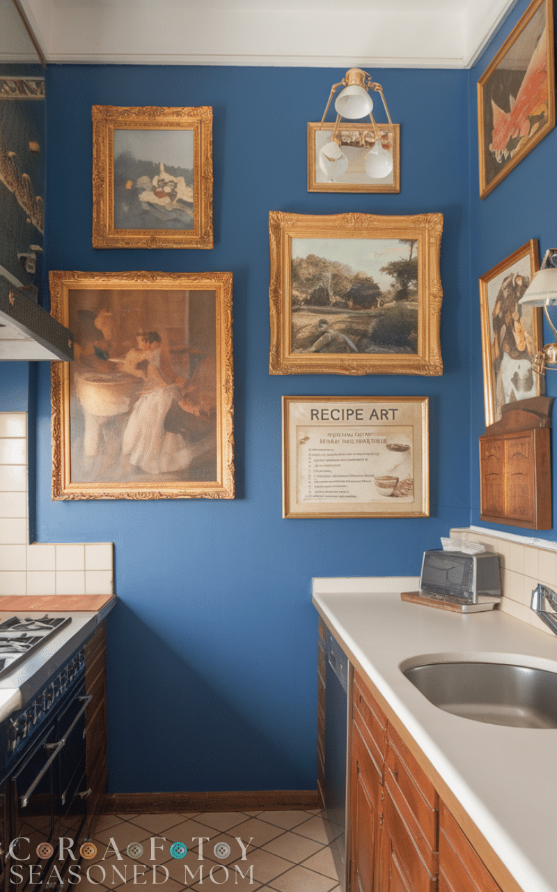 If you want one of the simplest blue and gold kitchen ideas then blue walls with gold framed artwork are an easy stylish choice and the blue paint creates a calm background while the gold frames add instant warmth and sophistication and this combination allows you to express your personality through different prints photography pieces or recipe art and you can choose frames with a matte gold finish or a shiny polished style depending on your taste and this idea works beautifully in kitchens with open wall space or dining areas connected to the kitchen and the visual harmony created by blue walls and gold frames makes the room feel elegant without requiring major renovations which makes it one of the most approachable blue and gold kitchen ideas.
