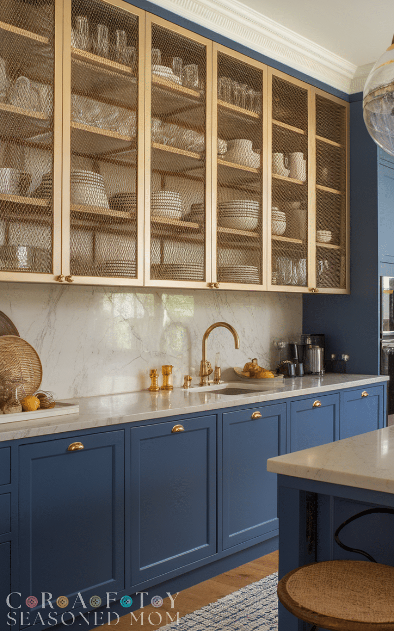 Gold mesh doors bring a unique stylish twist that makes this one of the most original blue and gold kitchen ideas and when you apply gold mesh on a blue cabinet front the combination adds texture character and a high end design feeling without being too heavy and this is perfect for showcasing beautiful dishes or glassware while still keeping the look refined and elegant and the blue base creates calmness while the gold mesh adds visual interest and warmth and this pairing works well in both modern and traditional kitchens because it gives the perfect balance between functionality and design detail and this makes it one of the most eye catching blue and gold kitchen ideas.