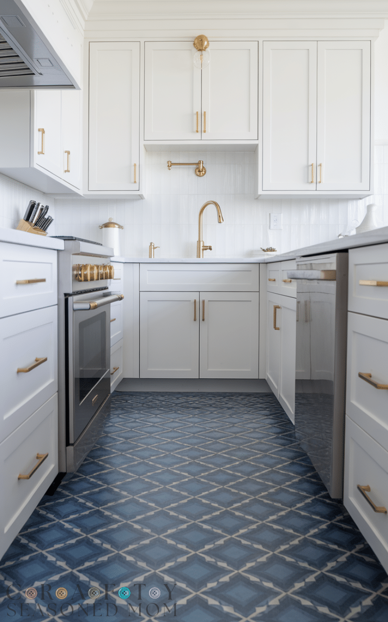 Blue patterned floors bring creativity and energy which makes them an amazing option for blue and gold kitchen ideas and whether you choose mosaic tiles Moroccan patterns or geometric styles the blue tones create movement and interest under your feet and when paired with gold cabinet handles gold faucets or gold lighting the space gains warmth and balance and you can keep the rest of the kitchen simple with white or soft toned cabinets to let the floor be the highlight and this combination adds personality without sacrificing practicality because patterned floors are durable and easy to clean and this bold yet harmonious pairing makes it one of the most expressive blue and gold kitchen ideas.