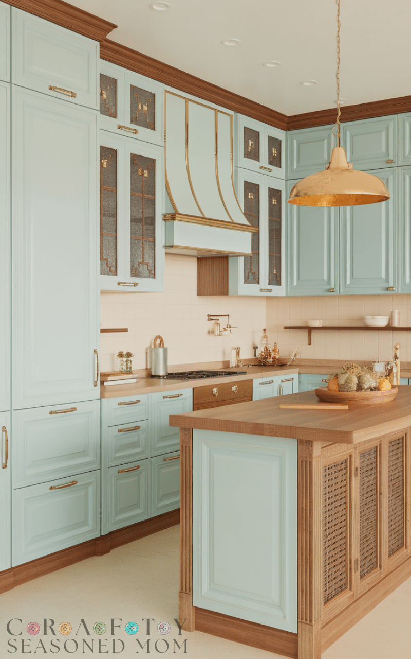 Soft powder blue creates a light airy look which makes it one of the sweetest blue and gold kitchen ideas and when you choose this shade your kitchen feels calm and relaxing because it has a gentle and uplifting character and gold knobs or gold handles add the right amount of warmth and charm without overwhelming the soft tone and this style fits perfectly in coastal homes farmhouse designs or even modern spaces that want a softer personality and you can use white countertops wooden shelves or simple open storage to complete the soothing atmosphere and this helps the kitchen feel bigger brighter and easier to style and the gold details feel like jewelry that completes the whole outfit and this balance makes powder blue with gold accents one of the most appreciated blue and gold kitchen ideas for anyone who loves quiet elegance.