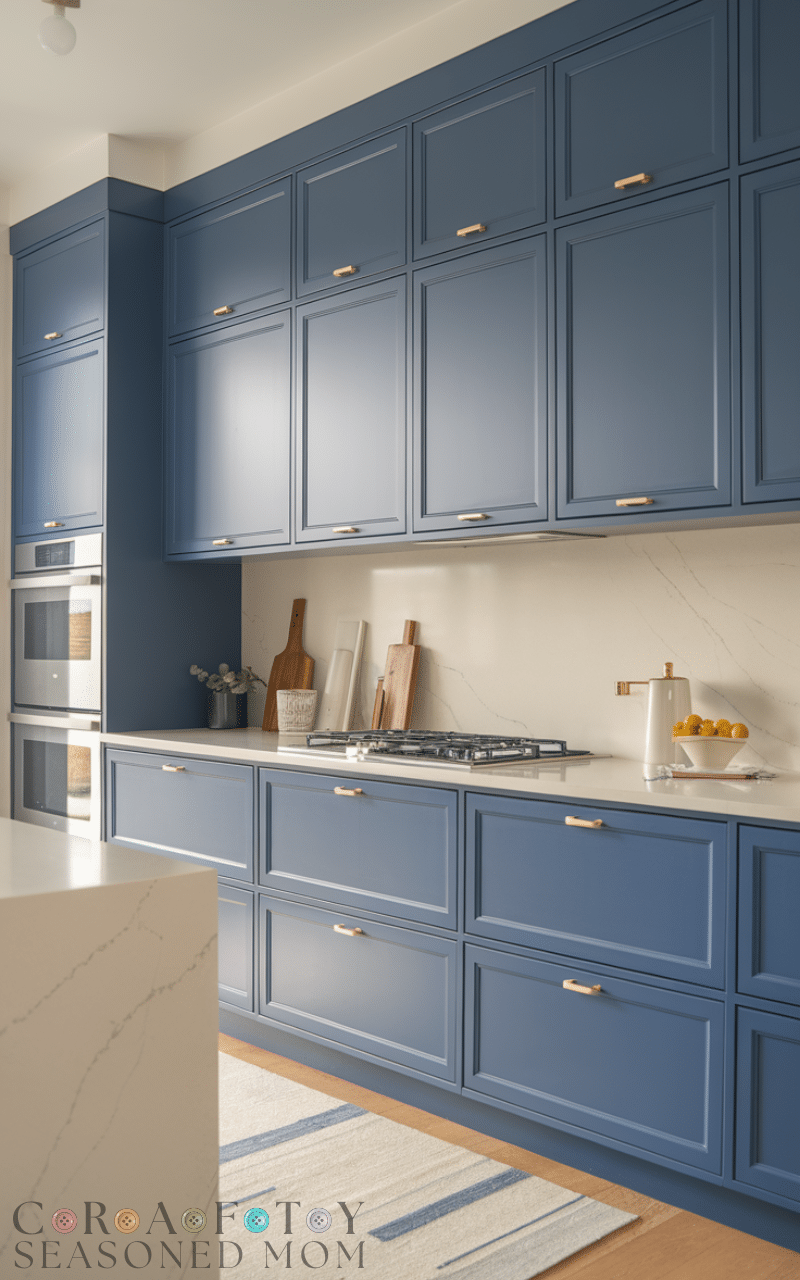 Matte blue finishes bring a modern refined feel to your kitchen which makes them perfect for blue and gold kitchen ideas and the soft non reflective texture adds calmness while brushed gold hardware introduces a warm modern edge that works beautifully with the matte surface and this pairing feels sleek minimal and stylish and it fits both contemporary and transitional homes and when you combine this look with clean lines flat front cabinets and simple lighting you create a kitchen that feels fresh and inviting without overwhelming the space and the brushed gold hardware has a gentle sheen that enhances the matte blue in a subtle elegant way and this harmony creates one of the most modern blue and gold kitchen ideas.