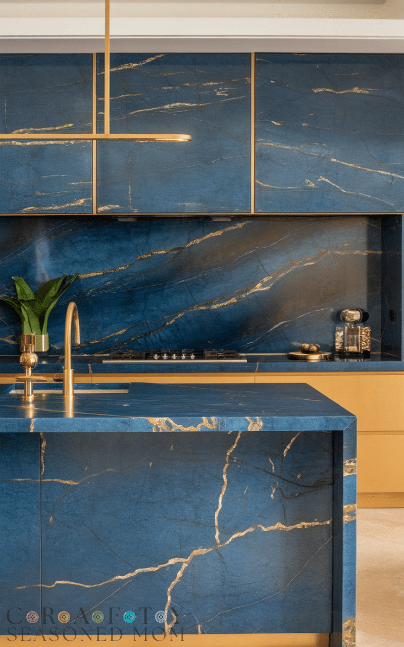 Blue marble or blue quartz with gold veins offers one of the most luxurious blue and gold kitchen ideas because the natural stone effect adds richness drama and beauty and the gold veins shimmer gently when light hits them which brings a feeling of elegance even in simple kitchens and this type of countertop or backsplash becomes a statement piece on its own so you do not need many extra details and you can pair it with simple gold lighting or minimalist decor for a balanced look and because the blue shades come in different intensities you can choose a subtle pastel tone or a deep royal effect depending on your taste and this natural luxurious combination elevates your kitchen instantly which makes it one of the most impressive blue and gold kitchen ideas.