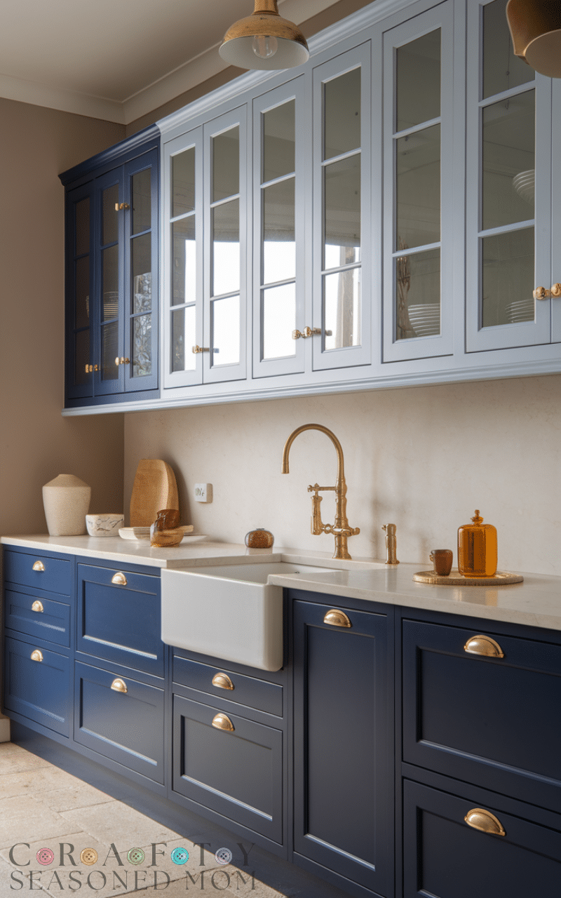 Two tone cabinets offer one of the most flexible blue and gold kitchen ideas and this design allows you to use two shades such as navy on the bottom and sky blue on top which creates a layered and balanced effect and adding gold handles or gold faucets brings everything together with warmth and elegance and this idea works especially well in kitchens that need dimension and movement because the variation of color breaks up the space in a natural way and you can pair this with white counters or natural stone surfaces for a fresh clean look and the gold accents serve as a unifying detail that keeps the color palette cohesive and stylish and this mix feels timeless and modern which is why this concept remains one of the most practical blue and gold kitchen ideas.