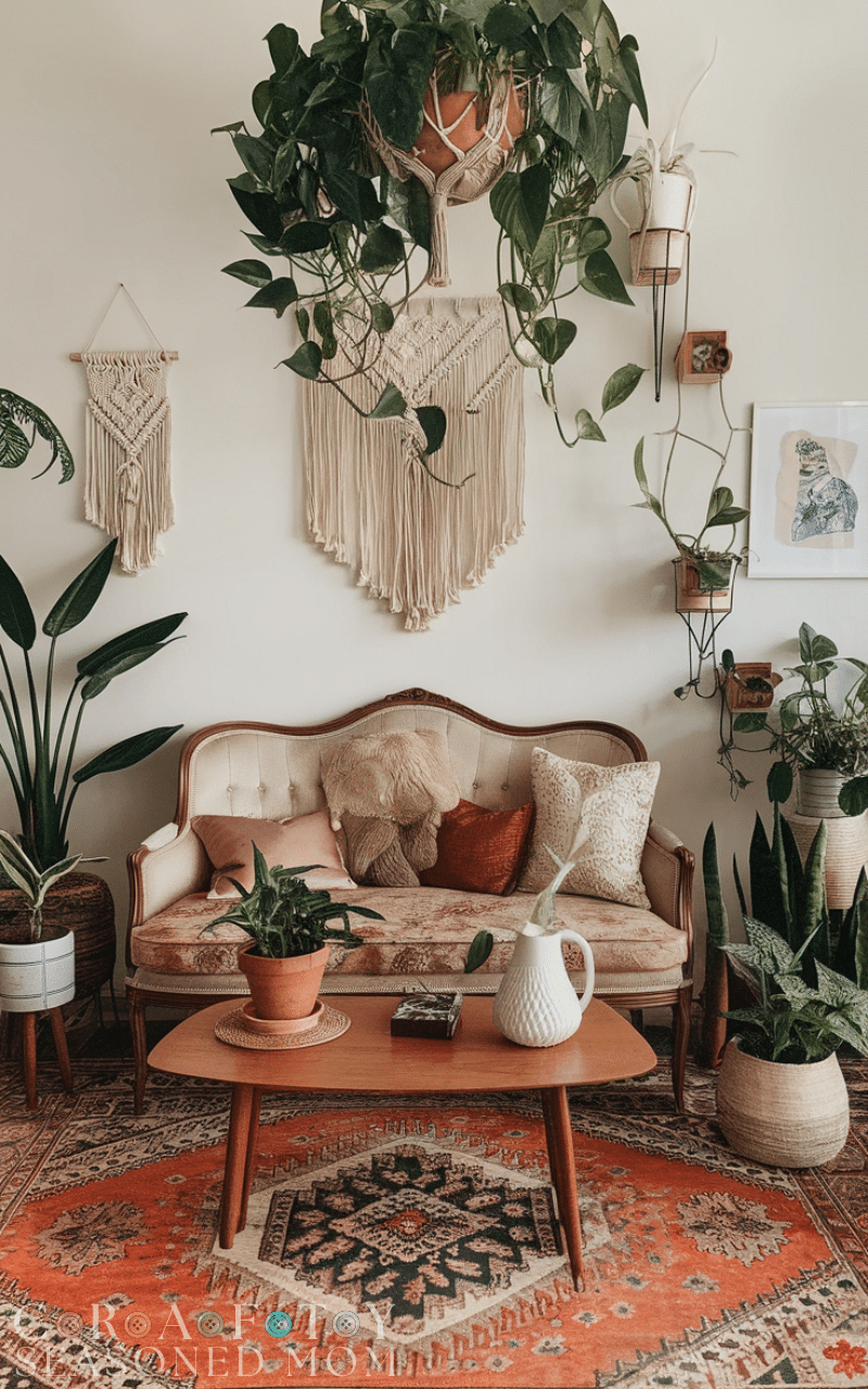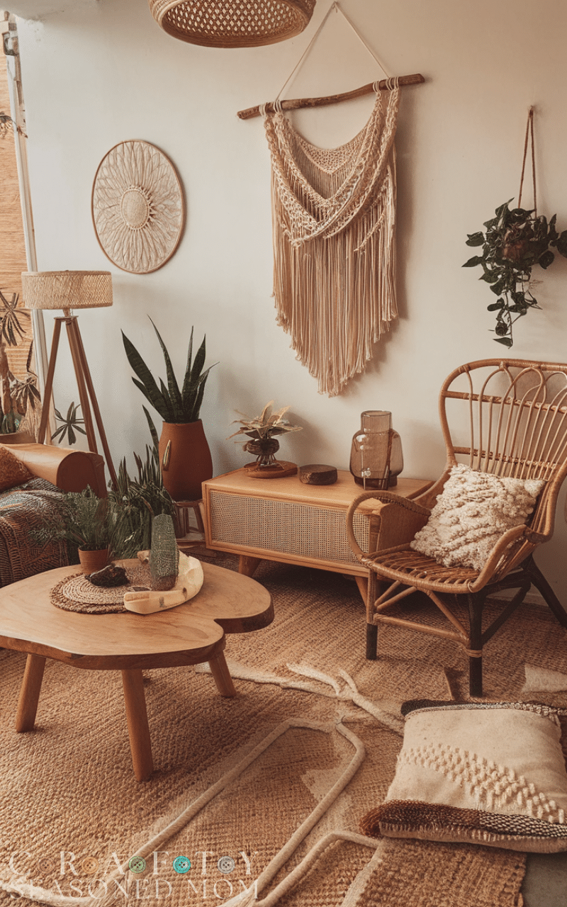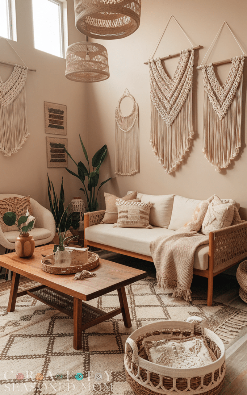 Macramé, baskets, and woven hangings add texture. This boho living room idea brings depth to walls while keeping the overall look soft and natural.