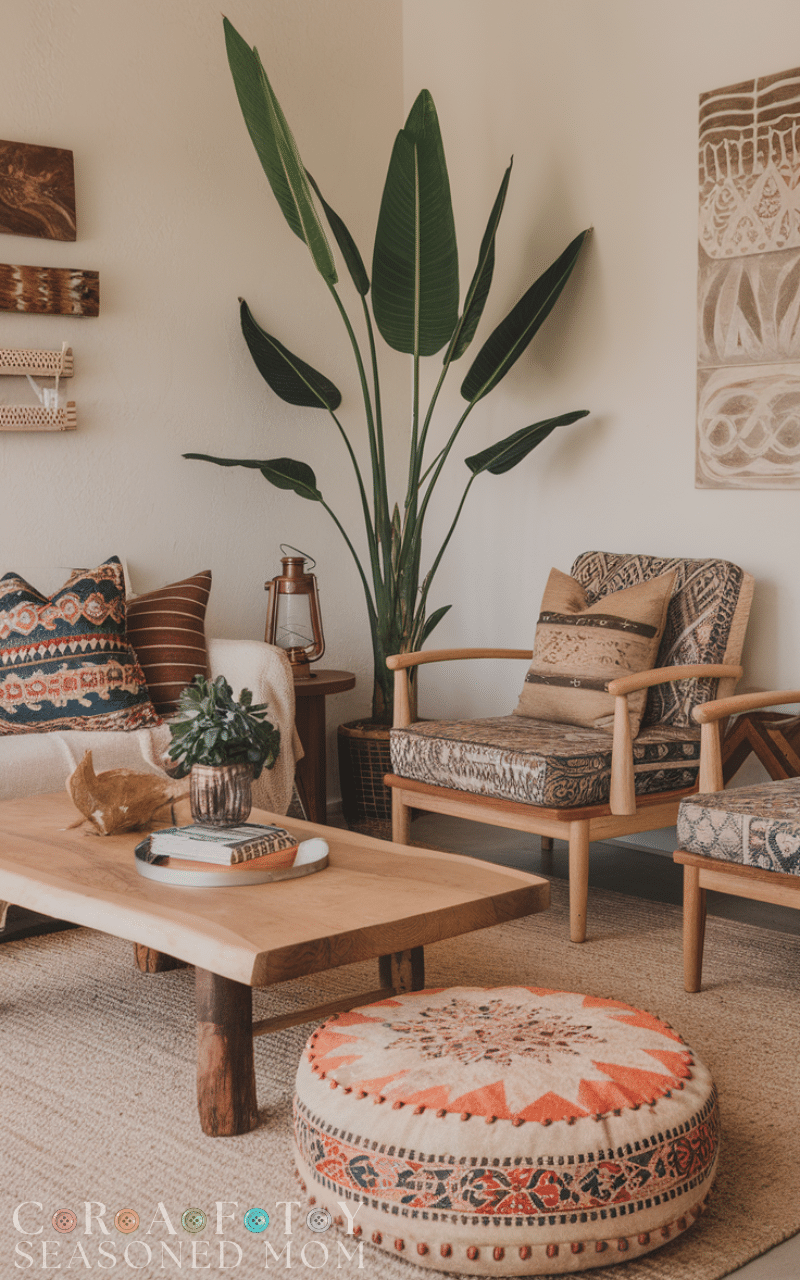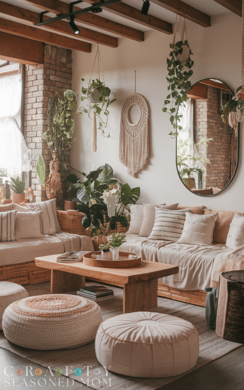 Low seating adds a relaxed vibe. Floor cushions, poufs, or low sofas create a casual and welcoming layout. This boho living room idea is perfect for informal gatherings and cozy lounging.
