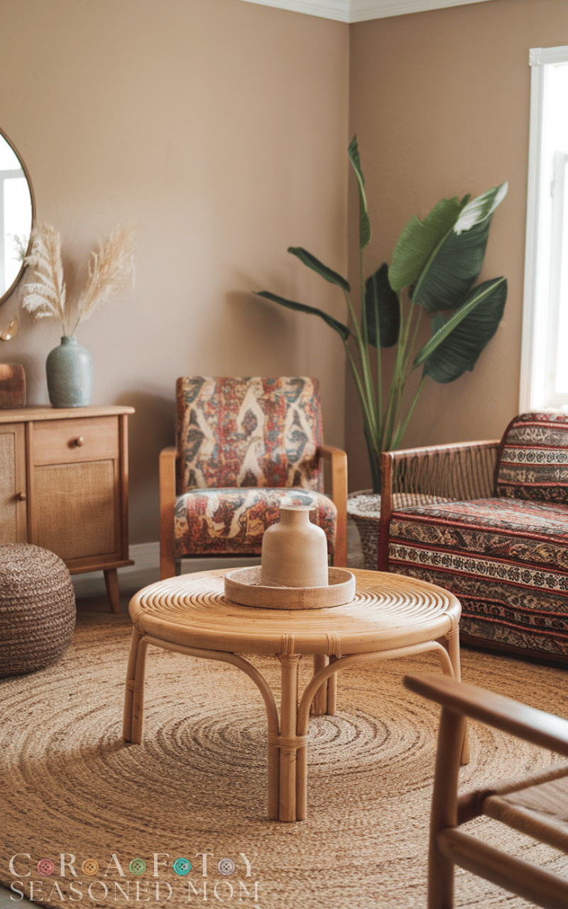 Incorporate natural materials like rattan, jute, and wood. This boho living room idea brings an earthy, grounded feel that balances colorful decor and creates a cozy, lived-in atmosphere.