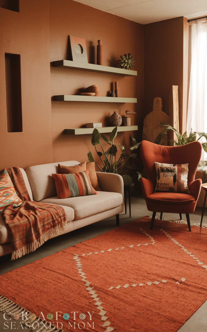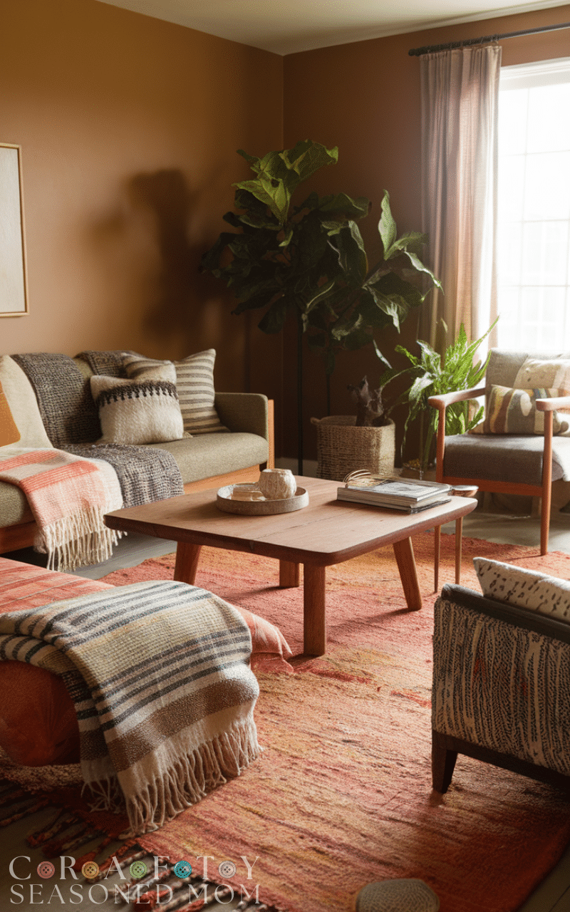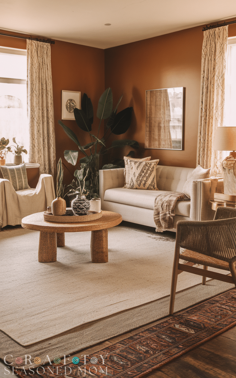 Use warm tones like terracotta, beige, rust, and olive. This boho living room idea keeps the space calm and cohesive while allowing colorful accents to stand out beautifully.