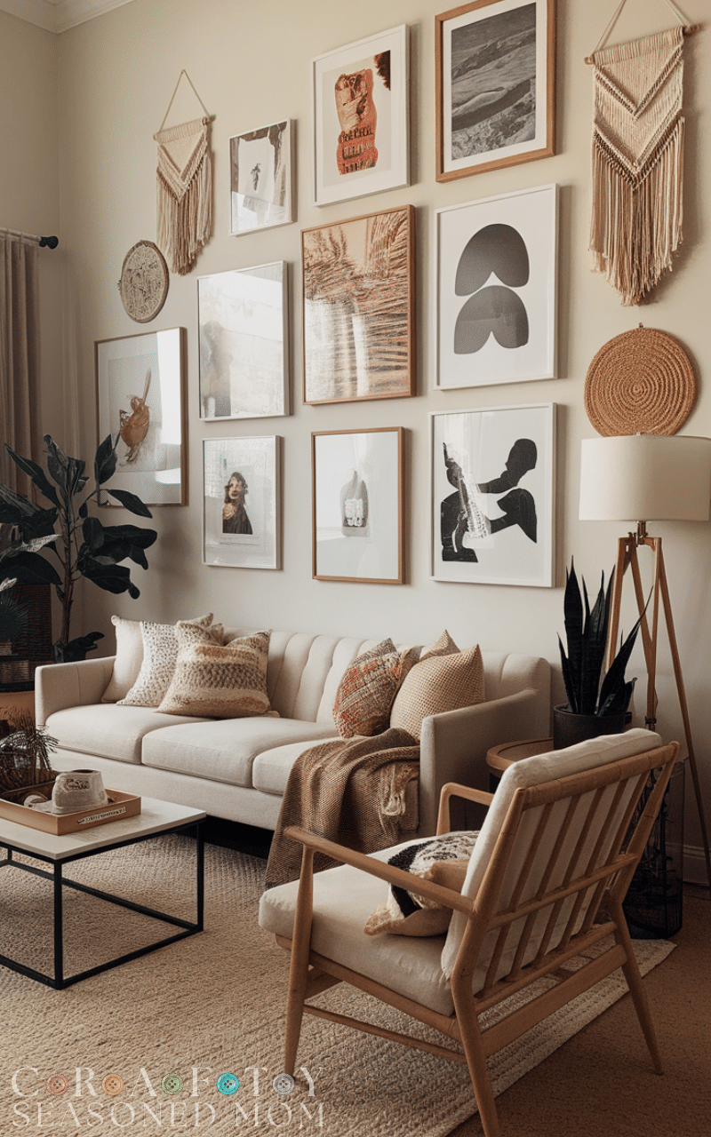 A gallery wall adds personality. Mix art prints, photos, and wall hangings. This boho living room idea reflects your story and creativity, making the space feel personal and expressive.