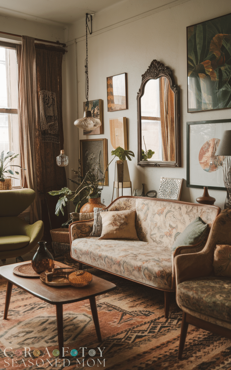 Mix vintage furniture and decor for character. This boho living room idea embraces imperfections and unique pieces, adding personality and charm while staying budget-friendly.