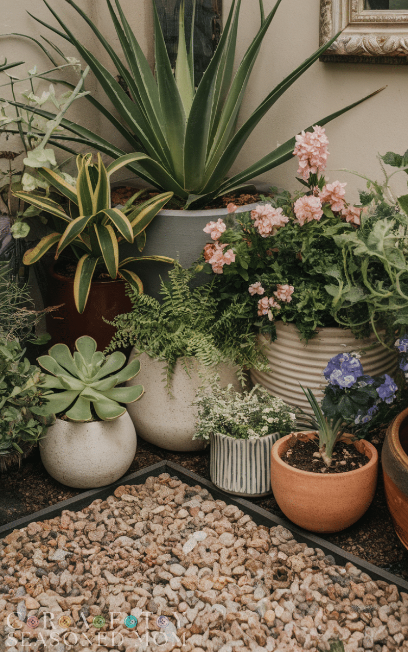Using gravel as a base with grouped pots on top is a clean and flexible option. This corner garden idea allows you to move plants around easily while keeping the space neat. Mixing different pot sizes and textures adds depth, and gravel helps with drainage and reduces maintenance.