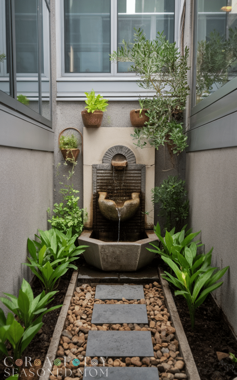 Adding a small fountain or water bowl can instantly elevate a corner. This corner garden idea brings soothing sound and movement, making the space feel calm and luxurious. Compact water features are budget-friendly and easy to install, and they naturally draw attention to corners that might otherwise be ignored.