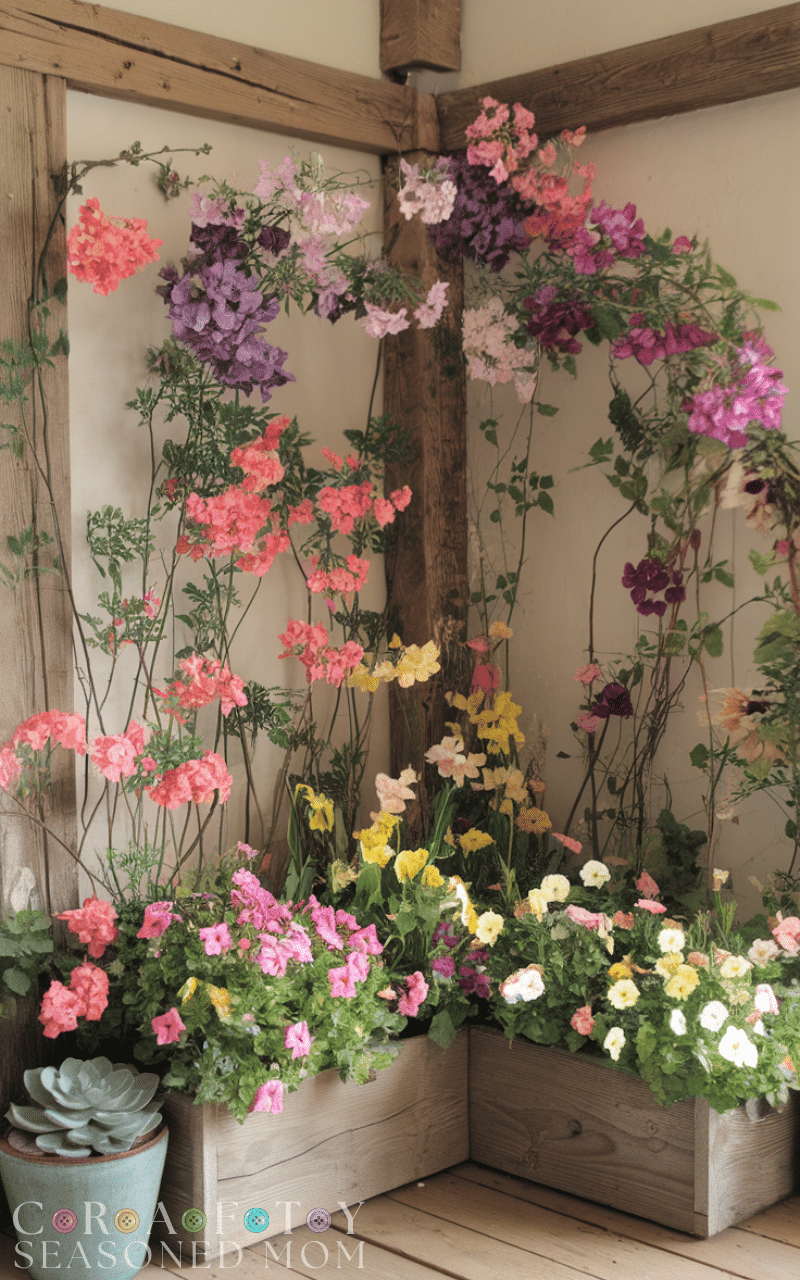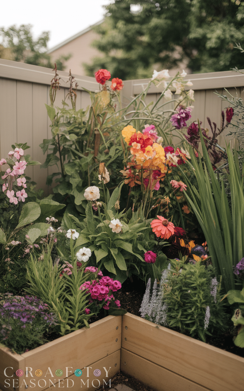 Filling a corner with colorful flowers creates a cheerful and welcoming look. This corner garden idea works well with mixed blooms and soft shapes that spill naturally into the space. Cottage-style planting adds charm and makes corners feel alive and full of personality.