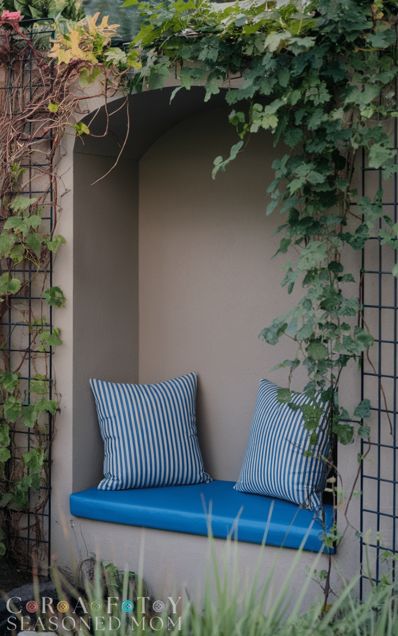 Turning a corner into a small seating nook is one of the most inviting corner garden ideas. A simple bench, a couple of outdoor cushions, and surrounding plants can create a peaceful retreat. This setup makes great use of awkward corners while adding functionality and charm. Even in small gardens, a seating nook helps define the space and encourages relaxation without requiring a large budget or complex landscaping.