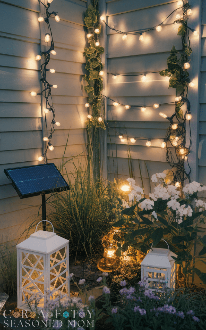 Lighting can completely change how a corner looks at night. This corner garden idea includes solar lights, lanterns, or string lights to highlight plants and decor. Soft lighting adds warmth and makes the garden usable and beautiful even after sunset.