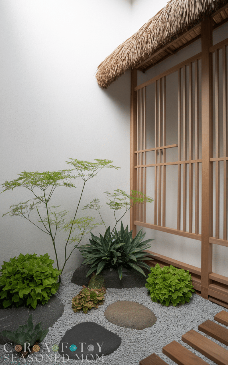 A minimalist corner garden inspired by zen design can feel calm and elegant. This corner garden idea uses stones, gravel, and a few carefully chosen plants. Keeping the design simple helps the corner feel peaceful and intentional, perfect for relaxation and low maintenance.
