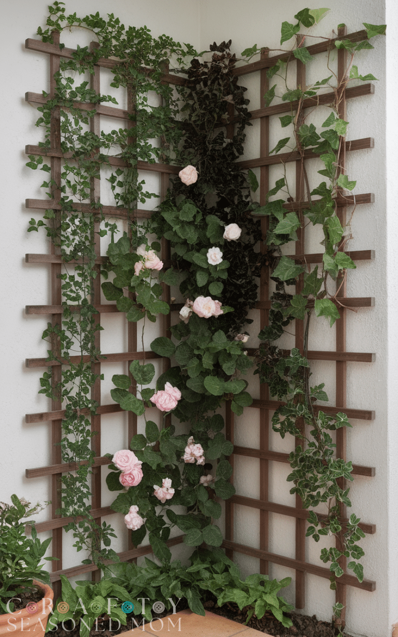 A trellis placed in a corner supports climbing plants like jasmine, ivy, or roses. This corner garden idea adds height, privacy, and a romantic feel. Climbing plants soften hard edges and turn plain corners into green, living walls that grow more beautiful over time.