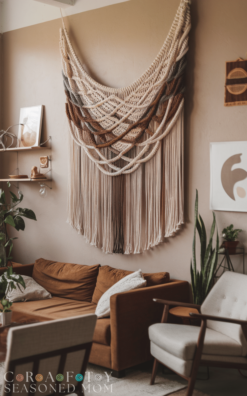 A simple wall tapestry adds softness and warmth. This diy wall art idea can be made from fabric, yarn, or macramé. It’s perfect for filling large walls and works beautifully in bedrooms or cozy living spaces.