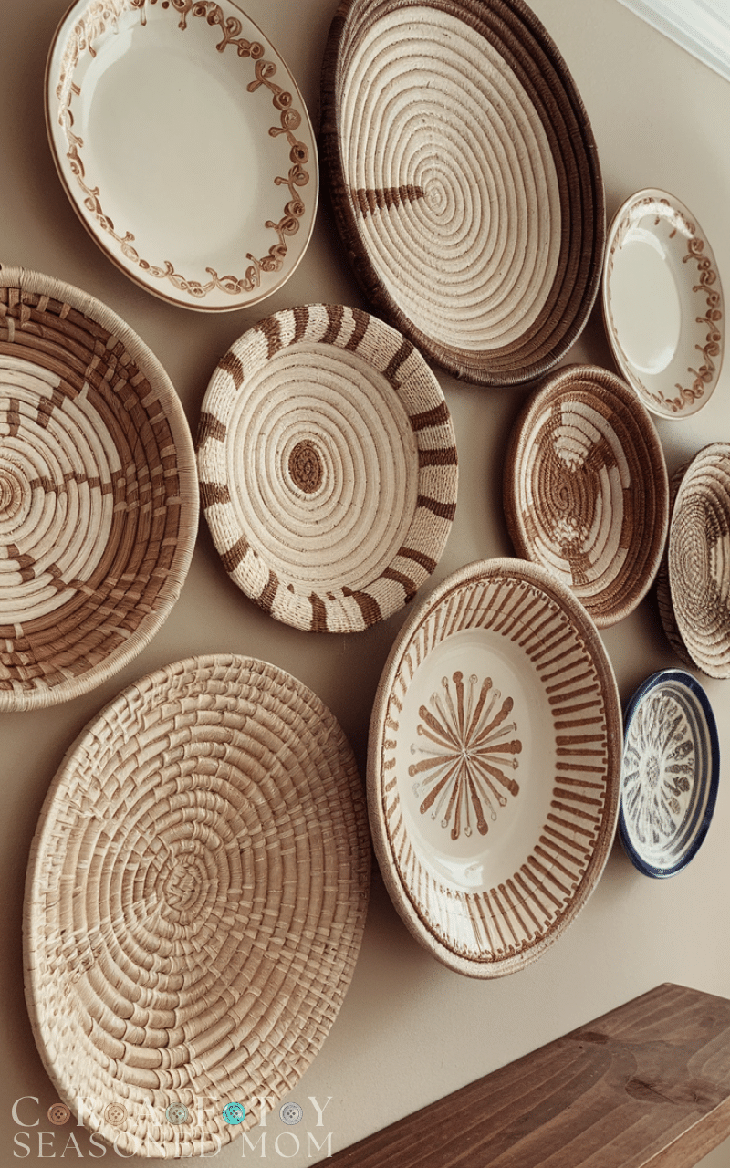 Hanging plates or woven baskets creates texture and charm. This diy wall art idea works especially well in dining areas or entryways. Mixing sizes and patterns adds visual interest while keeping the look cohesive and warm.