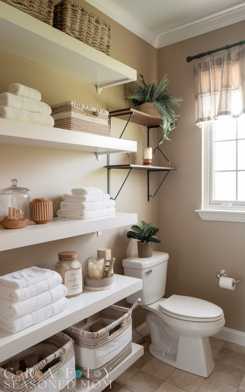Open shelving adds both style and functionality to your guest bathroom. Use chic baskets, neatly folded towels, and decorative jars to create a curated look. Elegant guest bathroom ideas that incorporate shelving help organize essentials while doubling as décor. Wooden or metal shelves in sleek designs complement the overall aesthetic, providing space for soaps, candles, or small plants. This not only keeps the bathroom tidy but also allows you to display personal touches that make the space feel thoughtfully designed and inviting for every visitor.