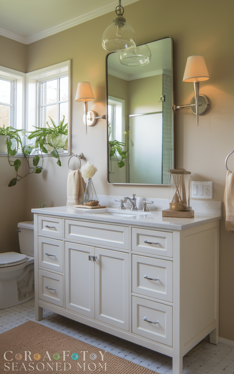 Lighting plays a critical role in elevating your guest bathroom. Wall sconces or pendant lights above the vanity add sophistication and improve functionality. Choose fixtures with gold, chrome, or matte black finishes to complement the rest of your decor. Elegant guest bathroom ideas often feature layered lighting, combining task and ambient light to highlight features like mirrors, countertops, and decorative accents. Proper lighting makes the space feel bright, welcoming, and chic, ensuring your visitors feel pampered even in a small bathroom space.