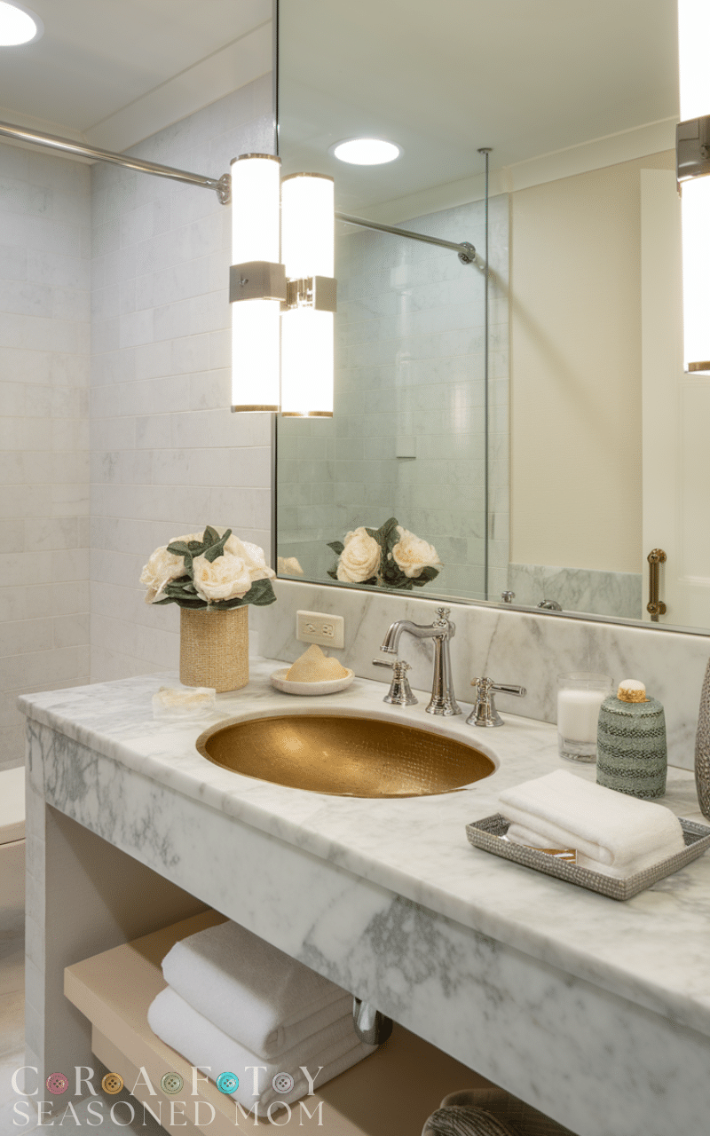 Marble countertops instantly elevate the elegance of any space, and your guest bathroom is no exception. Choosing sleek, polished marble adds a sense of sophistication while remaining timeless. Pair it with gold or chrome fixtures to create a luxurious, cohesive look. Elegant guest bathroom ideas like this not only impress visitors but also make daily upkeep feel like a treat. Opt for lighter shades of marble to keep the space airy and bright, and combine with soft hand towels and decorative accessories to complete a truly upscale feel.