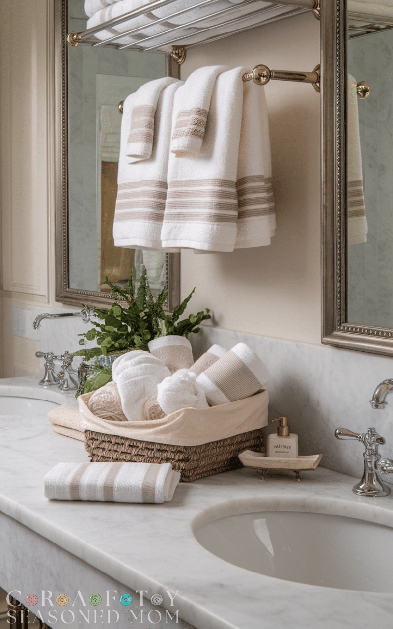 High-quality towels and bath linens instantly enhance the guest bathroom experience. Opt for plush, thick fabrics in neutral or coordinating shades for a spa-like feel. Elegant guest bathroom ideas featuring luxurious linens elevate comfort and style, making visitors feel pampered. Display towels neatly on racks or rolled in baskets to create a visually appealing, organized look. Small touches like embroidered initials or coordinating hand towels add an extra layer of sophistication, showing attention to detail and making your guests feel truly special during their stay.